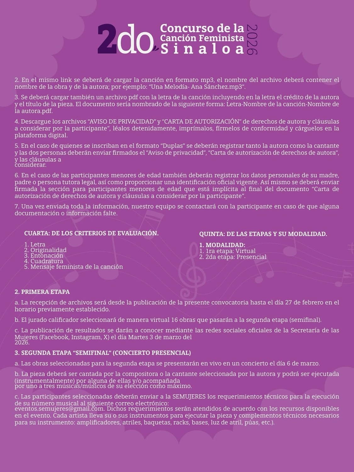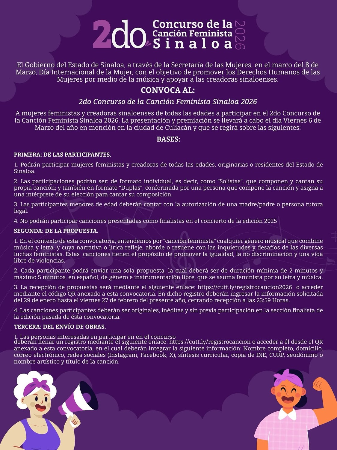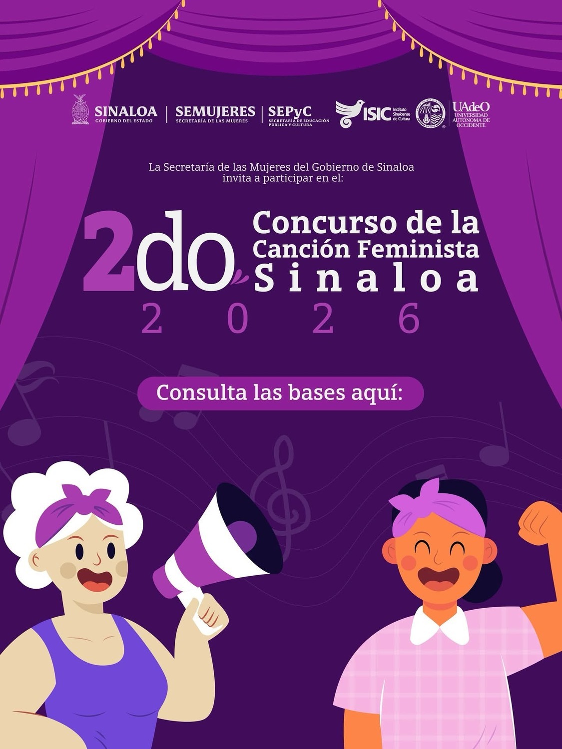 Culiacán, Sin.- En el marco del Día Internacional de la Mujer, el Gobierno del Estado de Sinaloa, a través de la Secretaría de las Mujeres, invita a creadoras sinaloenses a participar en el 2do. Concurso de la Canción Feminista Sinaloa 2026, una iniciativa que reconoce a la música como una poderosa herramienta de expresión, conciencia y transformación social, cuya convocatoria concluye este 27 de febrero.