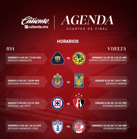 La Liga MX hizo oficial el calendario de los Cuartos de Final del torneo Clausura 2026, instancia que definirá a los cuatro semifinalistas rumbo a la Gran Final del próximo 24 de mayo.