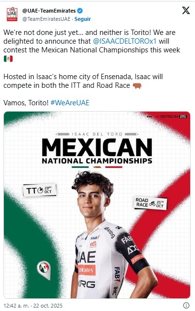 El UAE Team Emirates-XRG confirmó que el ciclista mexicano Isaac del Toro participará en el Campeonato Nacional de Ciclismo 2025, que se llevará a cabo en Ensenada, Baja California, su ciudad natal.