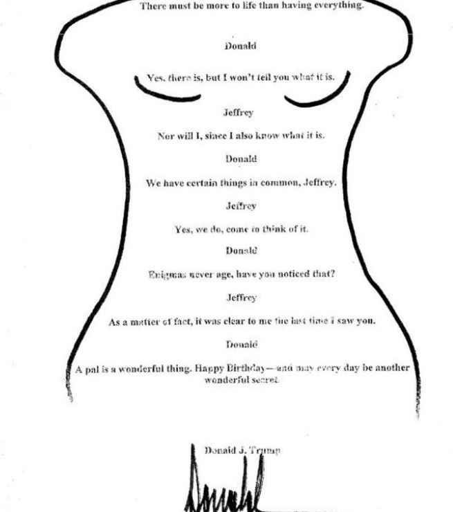 Según el medio, el documento contenía texto mecanografiado acompañado de un dibujo del contorno de una mujer, con una firma atribuida a Trump.