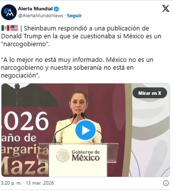 La presidenta Claudia Sheinbaum Pardo se refirió, este viernes 13 de marzo, a una publicación en redes sociales en la que Donald Trump dejó ver su postura, sobre que el territorio mexicano estaría gobernado por los cárteles de la droga.