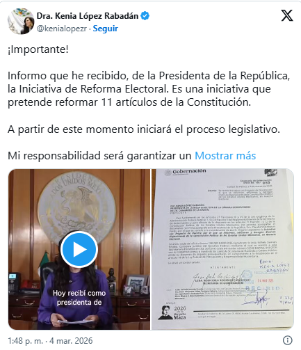 La presidenta Claudia Sheinbaum envió este miércoles a la Cámara de Diputados su iniciativa de reforma electoral, una propuesta que plantea cambios de fondo en el sistema político mexicano, entre ellos la reducción del presupuesto destinado a partidos y la eliminación de los senadores plurinominales.