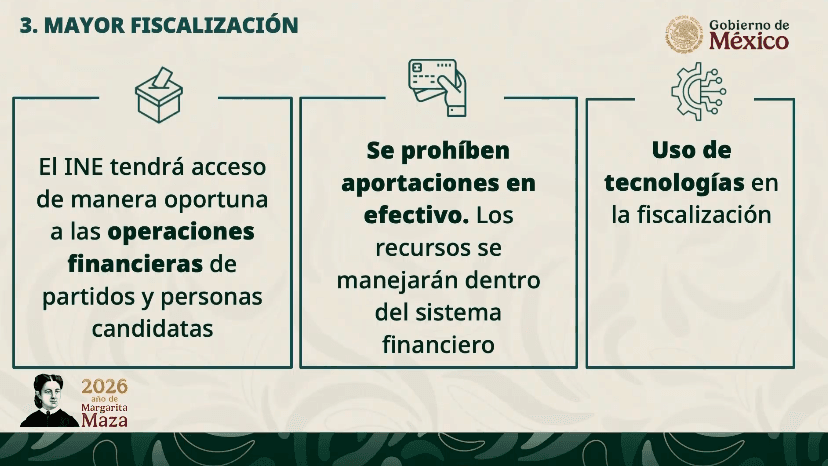 Sobre los recursos destinados a partidos políticos y candidaturas, se prohibierán las aportaciones en efectivo, además de reforzar el uso de las teconologías en la fiscalización de manera responsable.