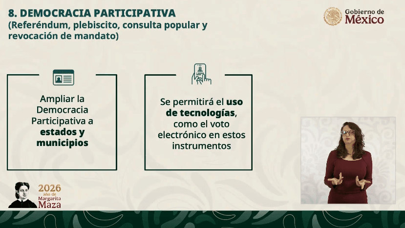8. Democracia ParticipativaSe buscará que se amplie la democracia a nivel estatal y municipal, donde llevará el uso de tecnologías, como el voto electrónico.