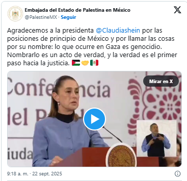 La postura de Sheinbaum fue respaldada públicamente por la Embajada de Palestina en México, que en redes sociales agradeció a la mandataria por su declaración: “Agradecemos a la presidenta @Claudiashein por las posiciones de principio de México y por llamar las cosas por su nombre: lo que ocurre en Gaza es genocidio. Nombrarlo es un acto de verdad, y la verdad es el primer paso hacia la justicia”.